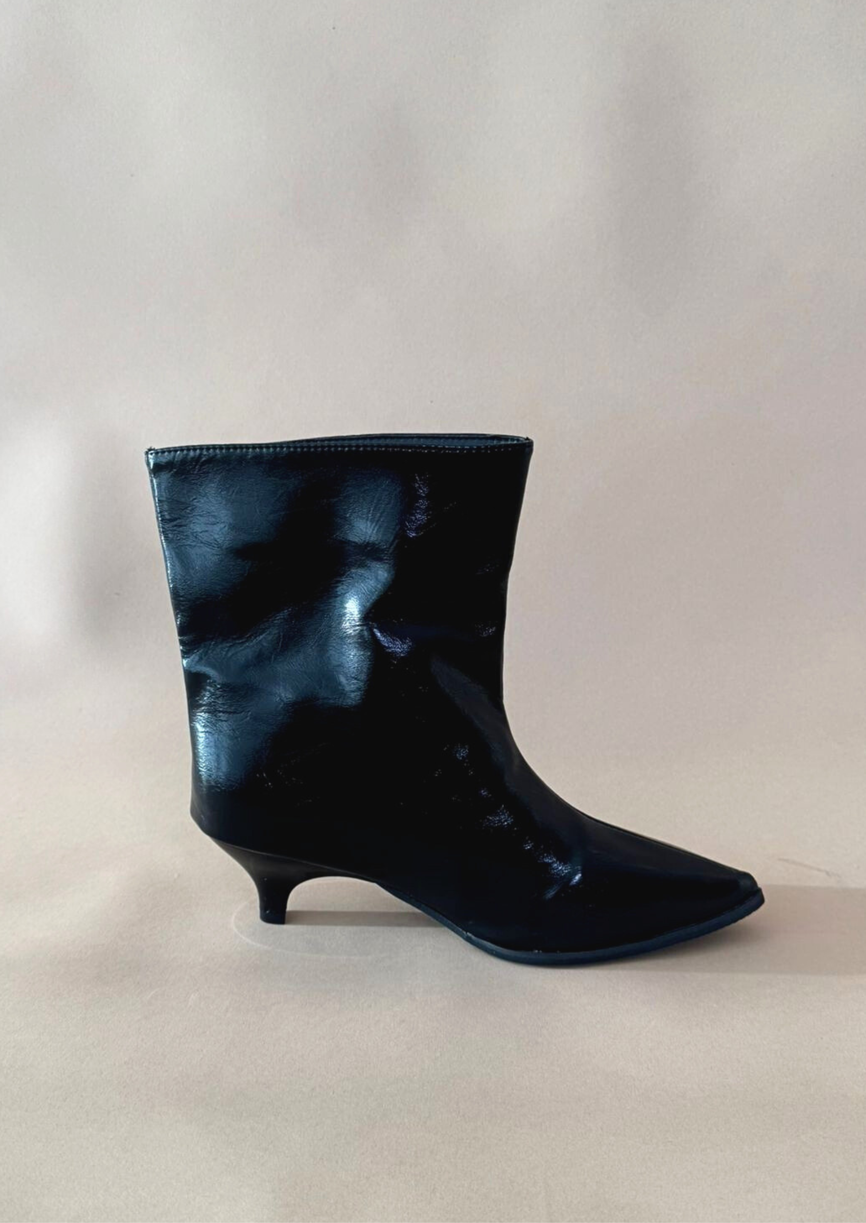 Estos botines de charol, con acabado en punta y tacón fino, elevan cualquier look con una mezcla perfecta de fuerza y sutileza. Su brillo refleja seguridad; su diseño, sofisticación.